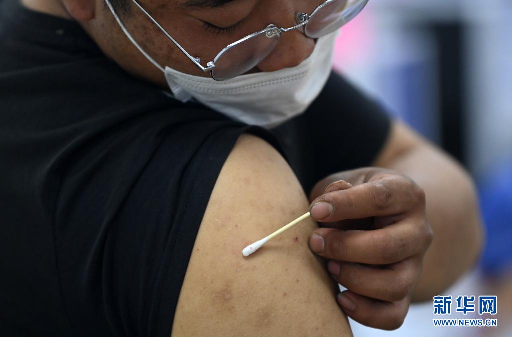 在天津市南开区红旗南路新冠疫苗临时接种点,一名“快递小哥”完成接种后手拿棉签进行止血(5月12日摄)。
