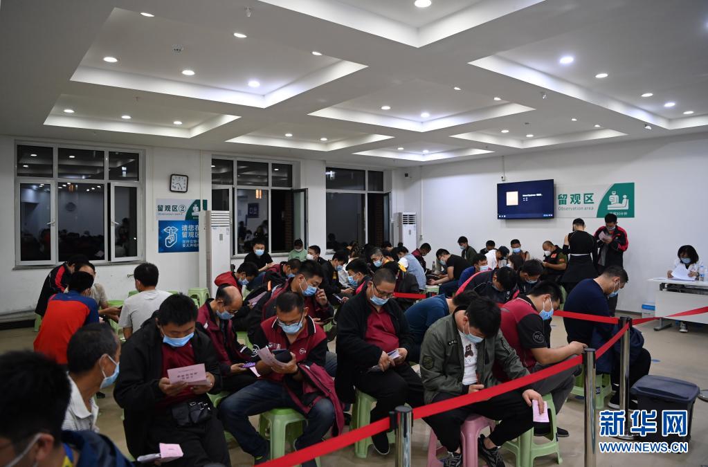 在天津市南开区红旗南路新冠疫苗临时接种点,快递从业人员在疫苗接种后进行留观(5月12日摄)。
