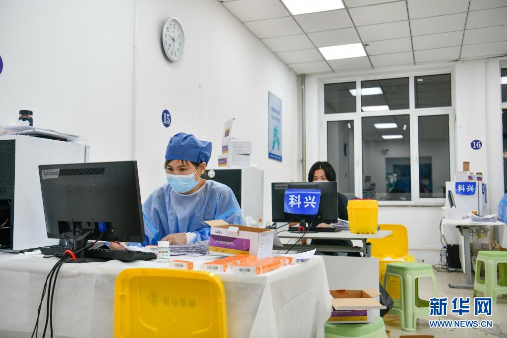 在天津市南开区红旗南路新冠疫苗临时接种点,医务人员核对统计疫苗接种信息(5月12日摄)。