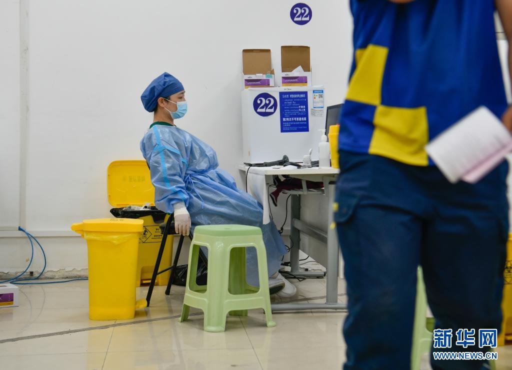 在天津市南开区红旗南路新冠疫苗临时接种点,一名医务人员在接种间隙休息(5月12日摄)。
