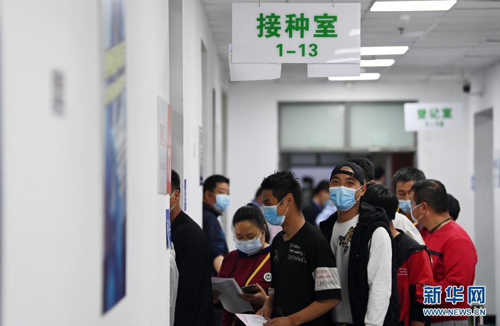 在天津市南开区红旗南路新冠疫苗临时接种点,快递从业人员排队准备接种疫苗(5月12日摄)。