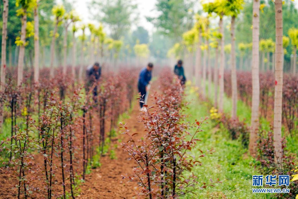 5月13日,河北省遵化市新店子镇西苇店村的农民在景观树苗圃内劳作。