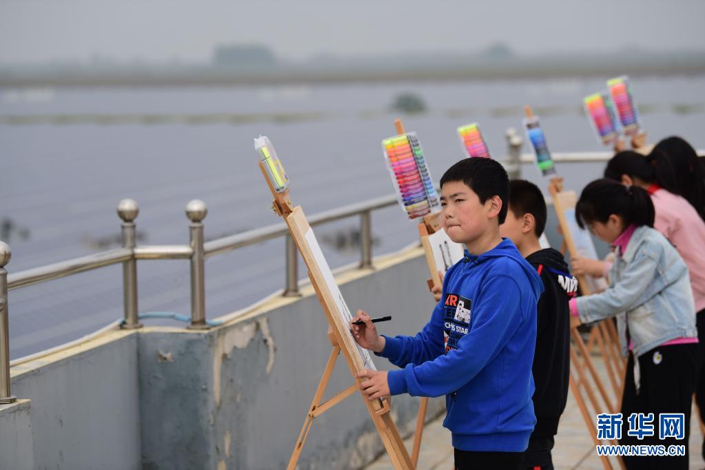 5月12日,在江苏淮安金湖县塔集镇光伏发电站,银涂镇中心小学学生进行绘画创作。