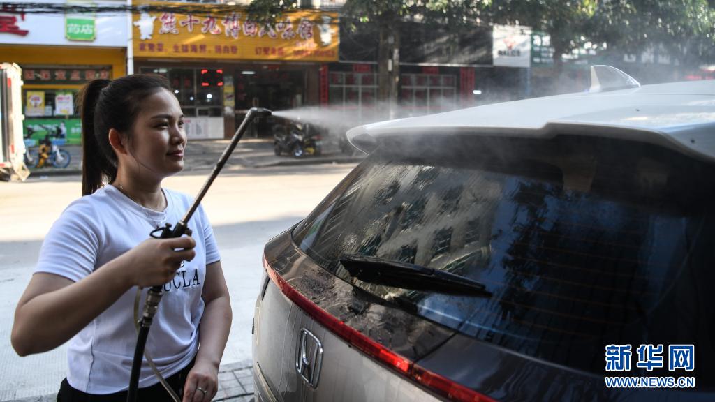 在广西钦州市,一名市民在用喷雾枪洗车,最大限度地节约用水(5月10日摄)。