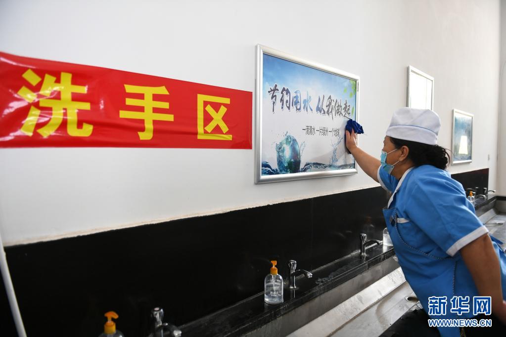 5月13日,食堂工作人员在内蒙古工业大学新城校区学生食堂内擦拭节水宣传栏。