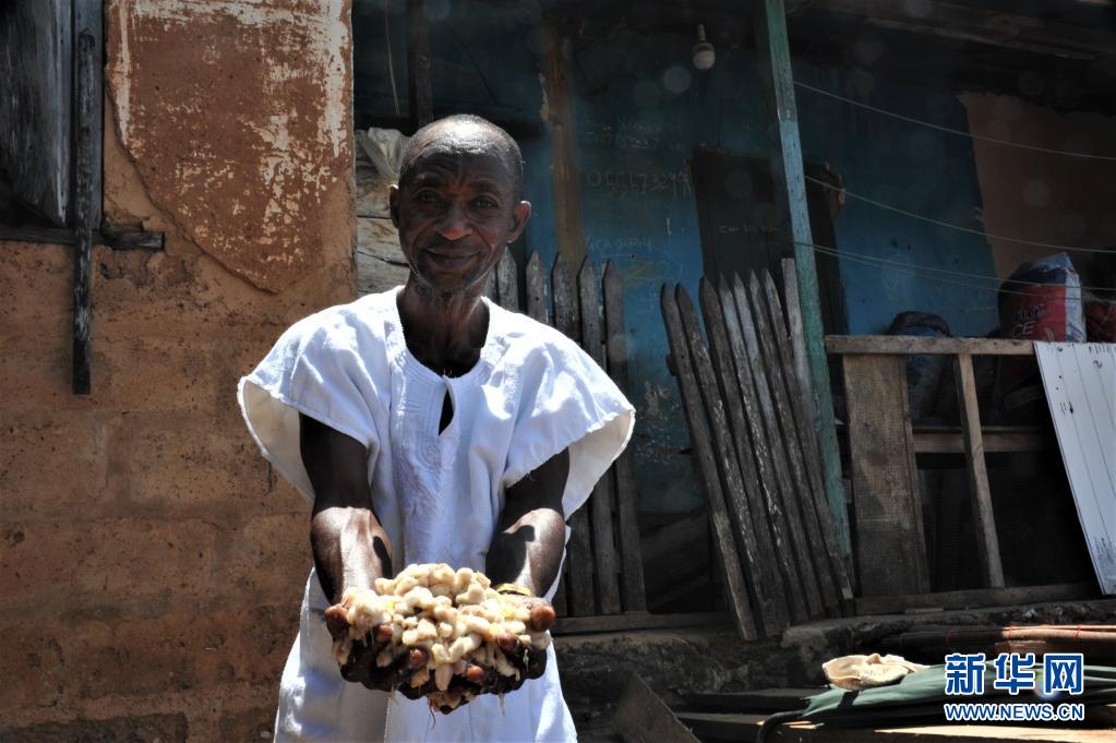 5月11日,在加纳东部省一处可可种植园,一名种植户展示新鲜的可可豆。