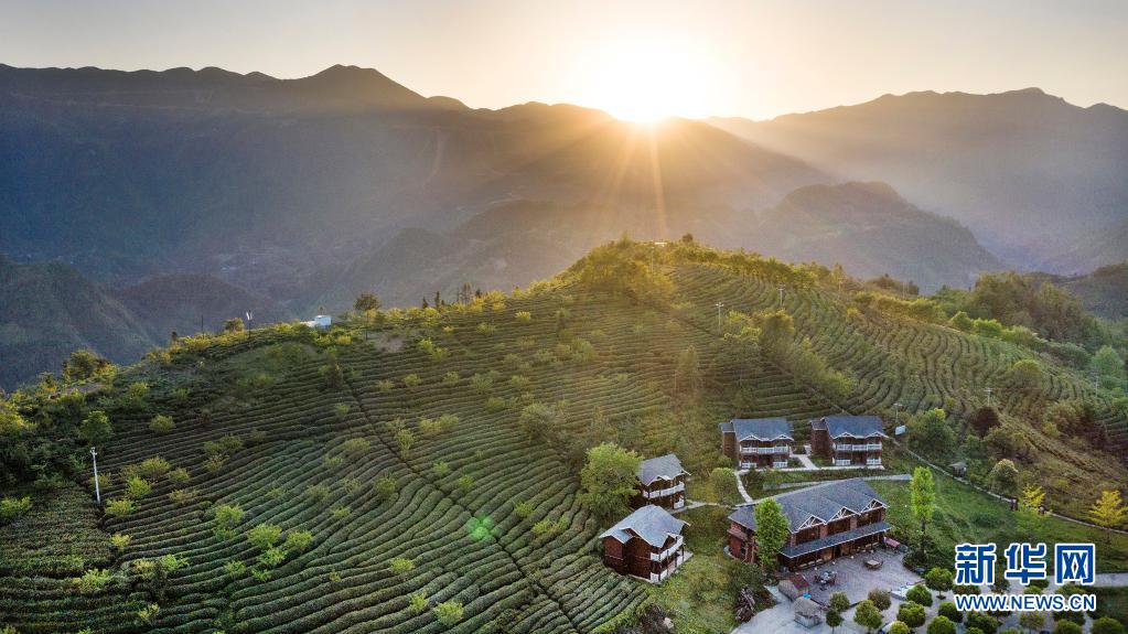 晚霞中的汉中市镇巴县观音镇丰源林牧业有限公司茶园(5月9日摄)。该公司种植高山富硒有机茶6200亩,山区移民搬迁群众长期在茶园茶厂务工,实现家门口就业。