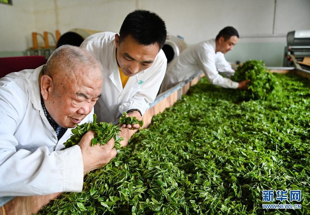 81岁的陕西茶业开拓者、高级农艺师蔡如桂(左)在汉中市南郑区远山眉茶叶专业合作社制茶车间查看红茶萎凋情况(5月10日摄)。守望秦巴山半个多世纪的蔡如桂1966年从安徽农学院茶业系毕业,来到偏远的巴山深处镇巴县蚕茶站,足迹踏遍秦巴茶区,手把手地将自己的技术无私地传授给茶农,成为陕南茶业的开拓创新者。如今秦巴山区的茶园里仍时常闪现着他的身影。
