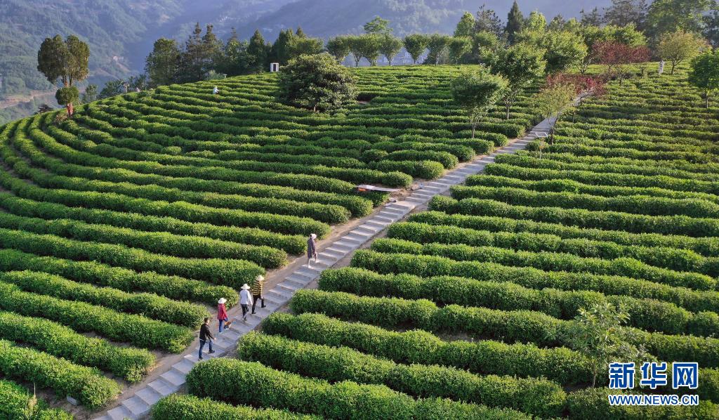 茶农在安康市紫阳县向阳镇的紫阳富硒茶观光园采茶(5月9日摄,无人机照片)。这里形成了5000亩茶园规模,不仅开展茶园丰产优质栽培技术培训、茶树良种选育等工作,也成为集茶山观光、民俗风情体验、休闲娱乐、特色产品购物于一体的观光游览地。