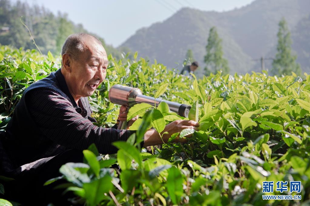 1957年出生的安康市紫阳县科技工作者梅紫青在茶园里查看富硒茶大叶泡品种的水分与折光率(5月9日摄)。1978年全国科学大会后,梅紫青在陕西省农科院专家的指导下,于1980年发现紫阳县为中国第二大富硒区,进而进入富硒茶开发研究;1989年该成果在北京通过鉴定,并获得国家星火计划金奖。目前富硒茶已为当地的主导产业。