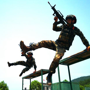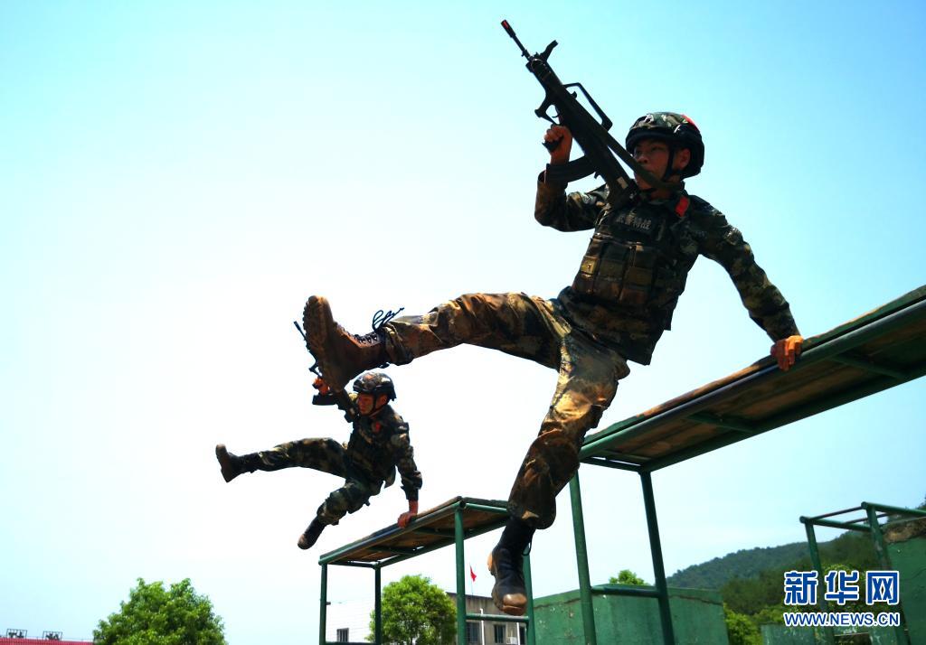 武警江西总队吉安支队井冈山中队官兵进行400米障碍训练(2020年5月13日摄)。