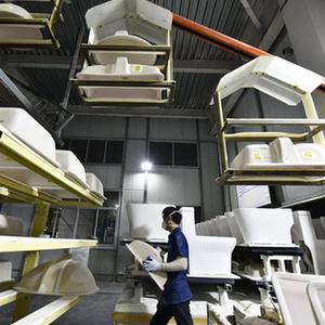 5月13日,唐山惠达卫浴股份有限公司的工人在卫生陶瓷产品生产线上工作。