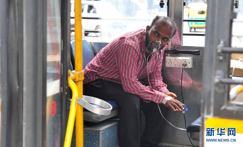 5月13日,印度班加罗尔的新冠患者坐在大巴车上吸氧。这辆大巴车为有吸氧需求的新冠患者提供免费的氧气服务。