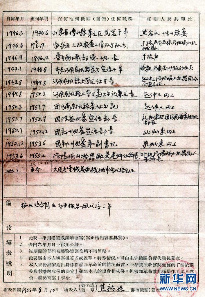 这是焦裕禄来到大连起重机器厂后,亲笔书写的履历表(资料照片)。新华社发(大连博物馆供图)