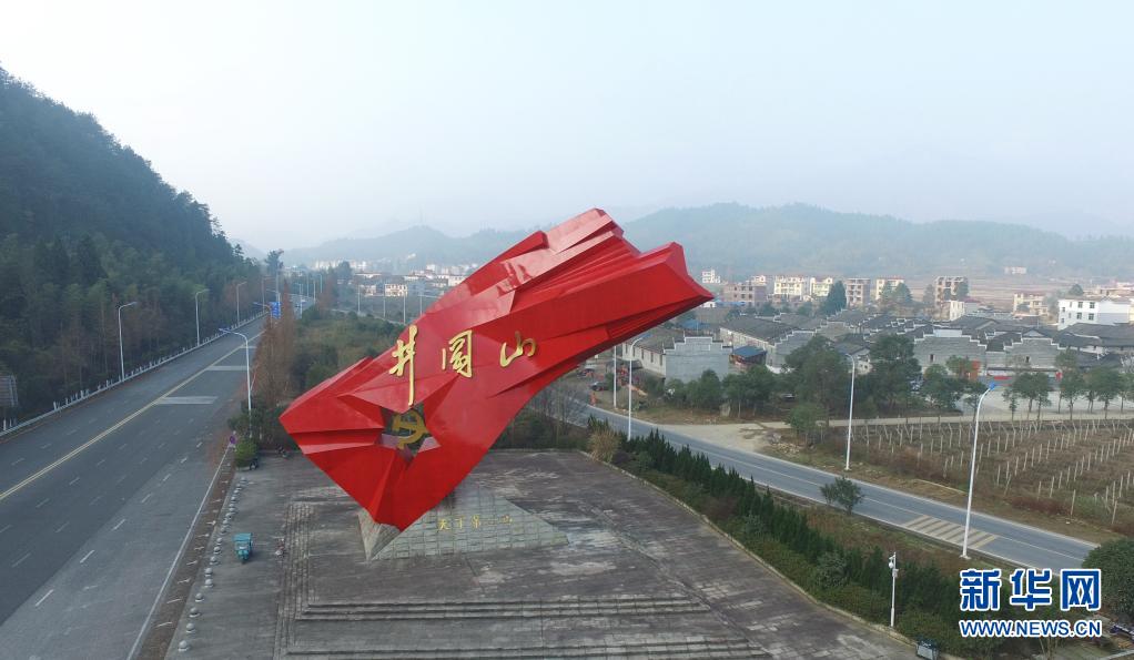 这是通往井冈山的泰井高速连接线旁的“井冈红旗”雕塑(2016年12月24日摄,无人机照片)。新华社记者 周密 摄