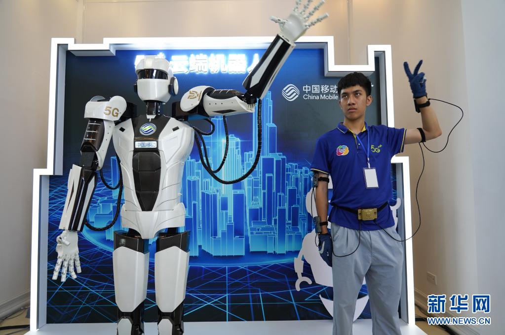在江西省鹰潭市举行的2019江西国际移动物联网博览会上,工作人员展示模拟人类动作的机器人(2019年7月18日摄)。新华社记者 周密 摄