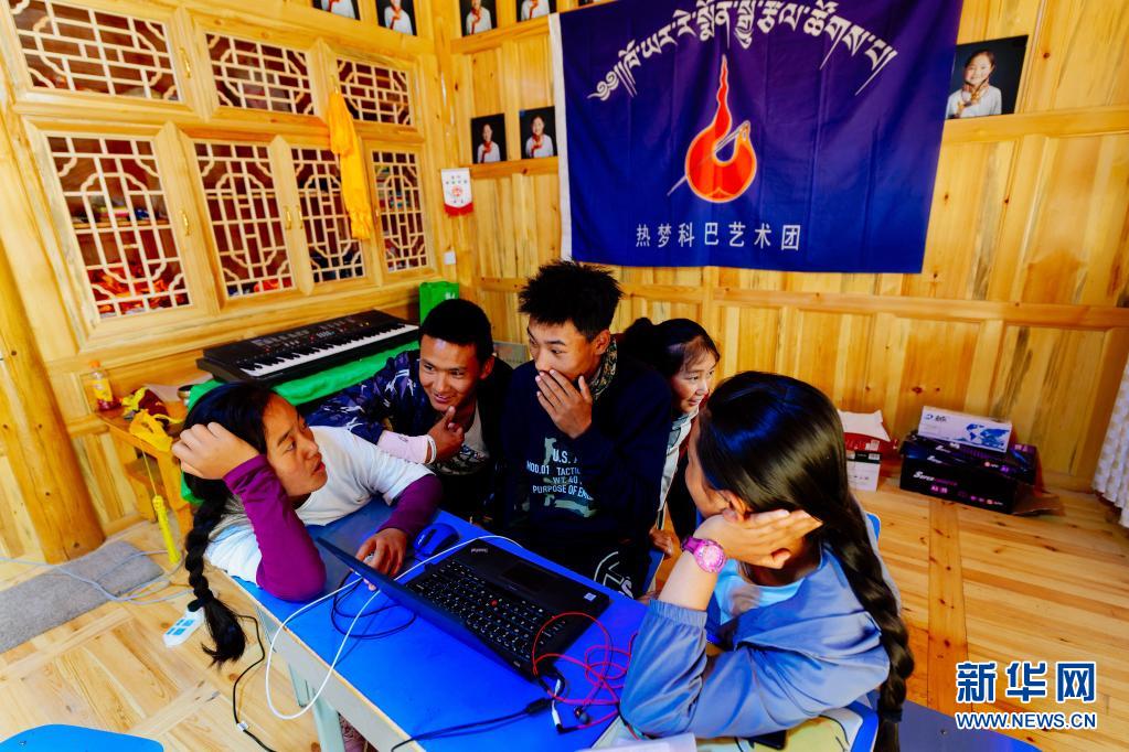 在青海省化隆回族自治县金源藏族乡科上村,热梦科巴艺术团部分成员进行高考志愿网上申报(2020年7月29日摄)。填报志愿前,加羊吉、拉毛东智、关却才让、群热吉和索南卓玛(从左至右)探讨彼此的志愿填报意向。他们最终如愿考入青海师范大学、中南民族大学和西北民族大学等高校。新华社记者 刘金海 摄