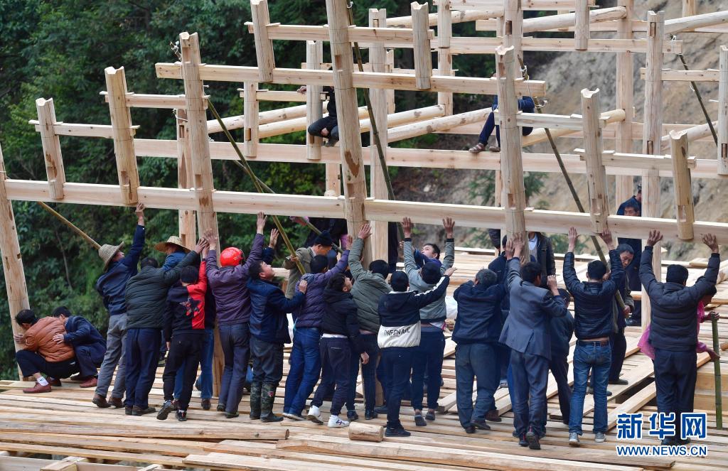 在广西融水苗族自治县杆洞乡党鸠村,村民在合力修建新木楼(2020年11月22日摄)。融水苗族自治县曾是国家扶贫开发工作重点县和滇黔桂石漠化片区县,也曾是广西20个深度贫困县之一,贫困发生率一度高达28.53%。2020年11月20日,广西壮族自治区人民政府批准融水苗族自治县退出贫困县序列。新华社记者 黄孝邦 摄