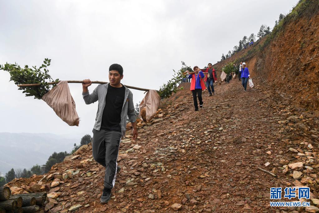 广西柳州市三江侗族自治县同乐苗族乡部分干部群众,前往高旁村的油茶产业基地,一起种植油茶树,带动当地村民发展油茶产业,拓宽致富门路(2021年3月19日摄)。新华社记者 曹祎铭 摄