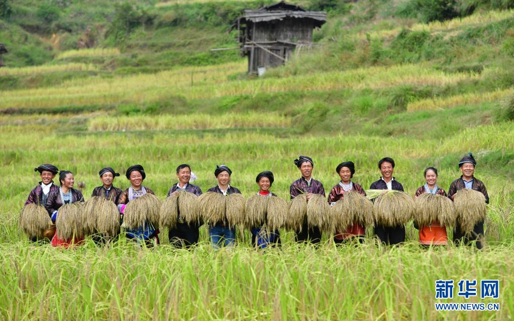 在广西融水苗族自治县良寨乡大里村,村民们展示刚刚收割的脱贫特色产品——紫黑香糯(2018年10月12日摄)。融水苗族自治县曾是国家扶贫开发工作重点县和滇黔桂石漠化片区县,也曾是广西20个深度贫困县之一,贫困发生率一度高达28.53%。2020年11月20日,广西壮族自治区人民政府批准融水苗族自治县退出贫困县序列。新华社记者 黄孝邦 摄