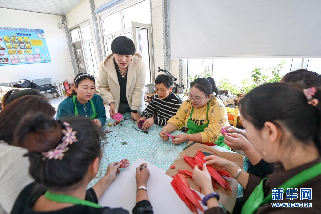 周艳文(站立者)在吉林省榆树市巾帼草编合作社联合社内带领社员制作草编产品(2021年3月2日摄)。返乡创业的周艳文成立榆树市巾帼草编合作社联合社,在当地多个乡镇和街道开展草编培训班,带领更多的姐妹加入草编事业。新华社记者 颜麟蕴 摄