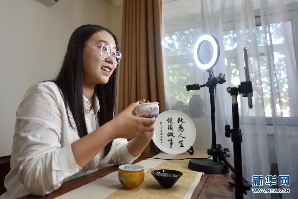 屠金歌通过网络直播出售非遗产品(2020年8月24日摄)。屠金歌是天津静象空间文化传播有限责任公司的创始人之一。在公司运营过程中,屠金歌和同伴意识到年轻一代对传统手工艺品和民俗文化的浓厚兴趣,她们挖掘优秀设计人才和手工艺从业者开发原创作品,与非遗匠人建立合作关系,通过网络直播、众筹等方式销售非遗产品,开启了保护、传承和创新非遗的创业之旅。新华社记者 赵子硕 摄