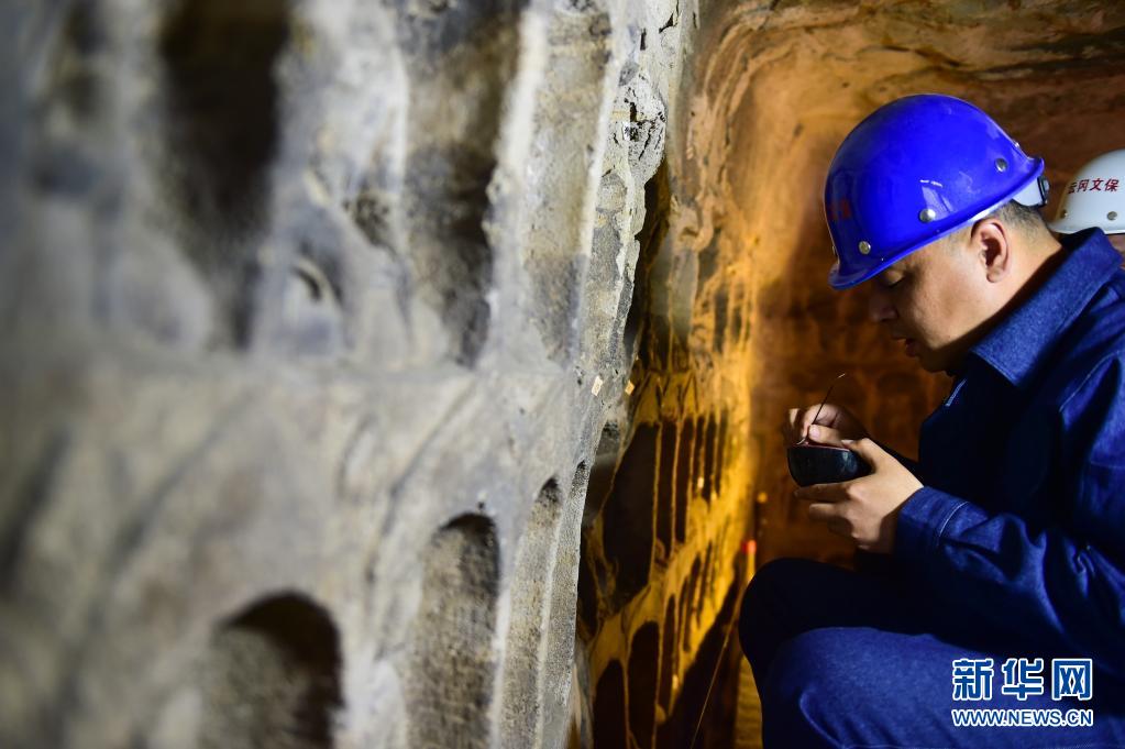 在山西大同云冈石窟39窟,石质文物保护中心工作室的“80后”工作人员孙波对石窟进行维护保养(5月7日摄)。新华社记者 柴婷 摄
