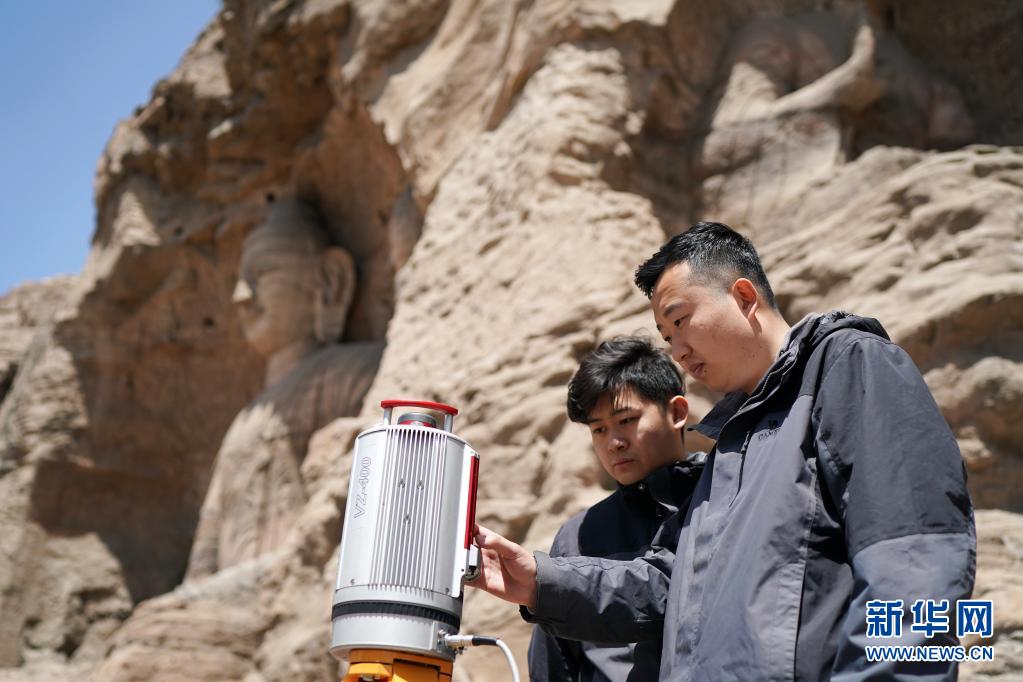 在山西大同云冈石窟,云冈石窟研究院数字中心工作室的“90后”工作人员王超(右)、李泽华在进行数据采集(5月8日摄)。新华社记者 詹彦 摄