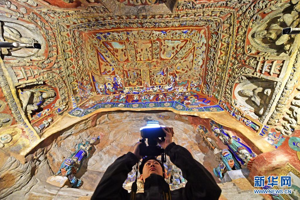 在山西大同云冈石窟,云冈石窟研究院数字中心工作室的“90后”工作人员李泽华在五华洞进行影像数据采集(5月8日摄)。新华社记者 詹彦 摄
