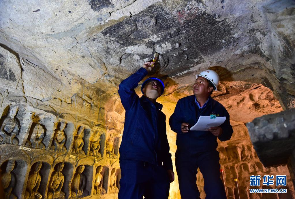 在山西大同云冈石窟39窟,石质文物保护中心工作室的“80后”工作人员孙波(左)对石窟进行维护保养(5月7日摄)。新华社记者 柴婷 摄