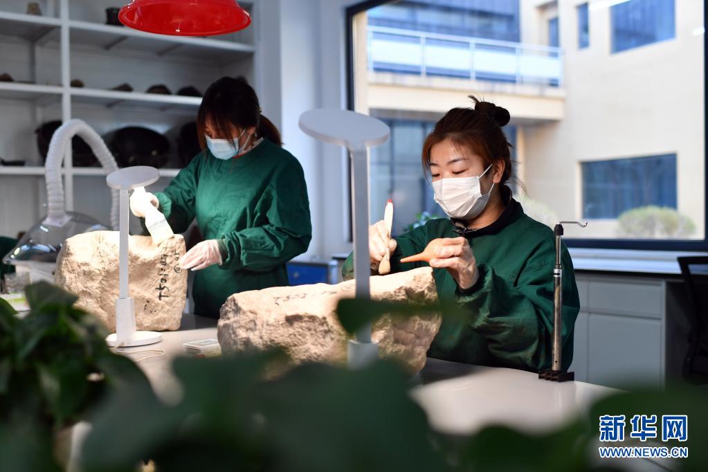 在云冈石窟研究院可移动文物修复室,“90后”工作人员管建玲 (右)在进行除尘作业(5月8日摄)。新华社记者 詹彦 摄