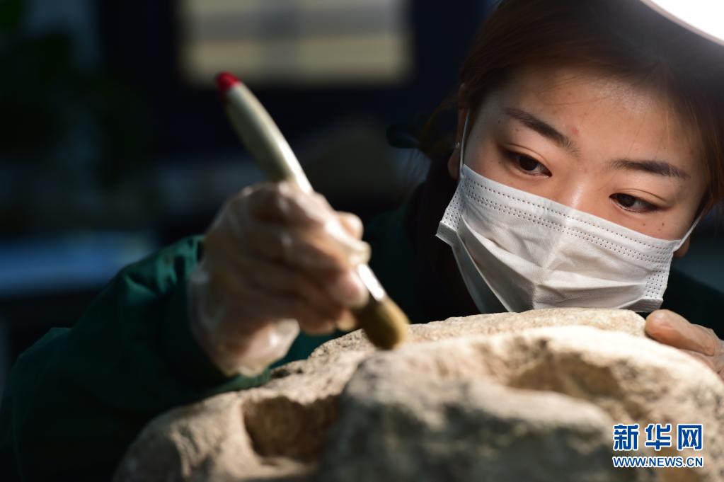 在云冈石窟研究院可移动文物修复室,“90后 ”工作人员管建玲在进行除尘作业(5月8日摄)。新华社记者 柴婷 摄