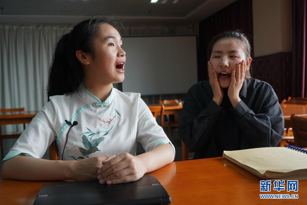 在南京特殊教育师范学院盲人图书室,周文晴(左)帮助盲人同学纠正普通话发音(2019年5月17日摄)。