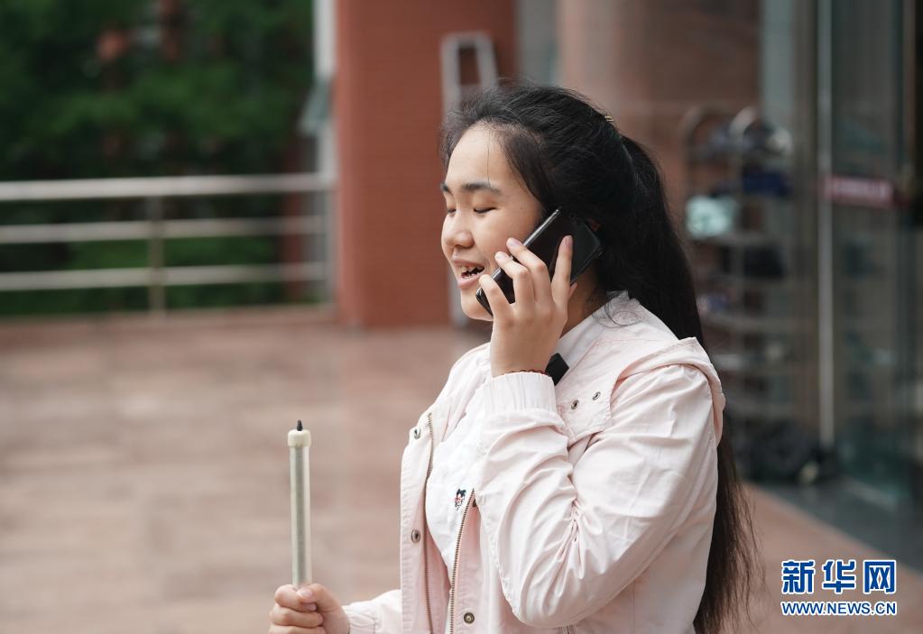 在南京特殊教育师范学院,周文晴在接听电话。中国人民大学研究生招生办老师征求她的意见,询问入学时需要提供哪些帮助(5月12日摄)。新华社记者 季春鹏 摄