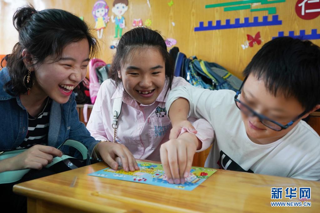 在南京市鼓楼区特殊教育学校进行社会实践时,周文晴(中)在跟小朋友一起玩游戏(2019年5月16日摄)。 新华社记者 季春鹏 摄