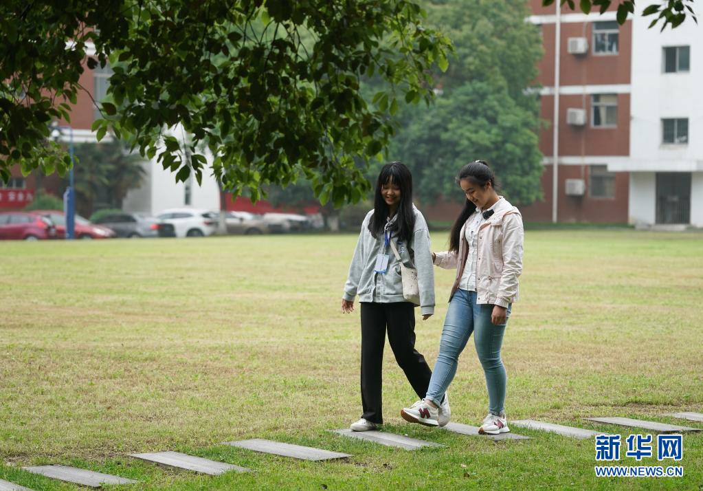 在南京特殊教育师范学院,周文晴(右)在同学的帮助下走在校园小道上(5月12日摄)。 新华社记者 季春鹏 摄