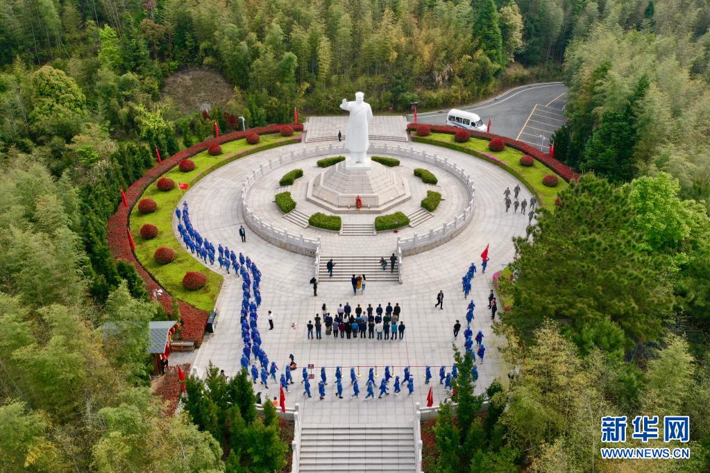 3月28日,人们在古田会议会址景区毛主席纪念园参观(无人机照片)。新华社记者 姜克红 摄