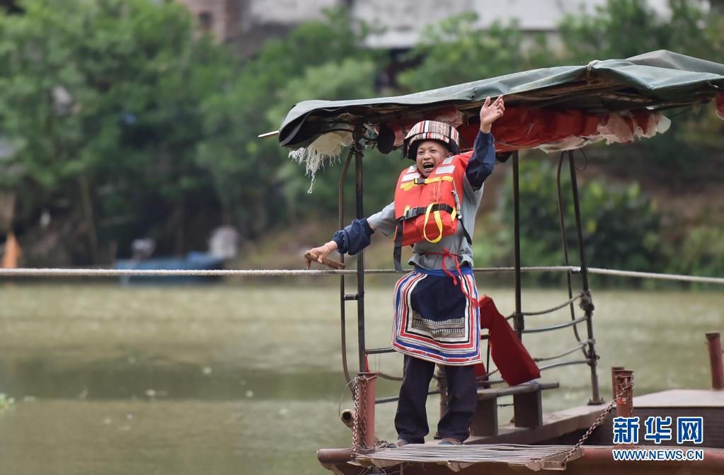5月13日,在广西贺州八步区黄洞瑶族乡黄洞渡口,赵仕斌在渡船上向放学后来渡河的小学生挥手。新华社记者 刘岭逸 摄
