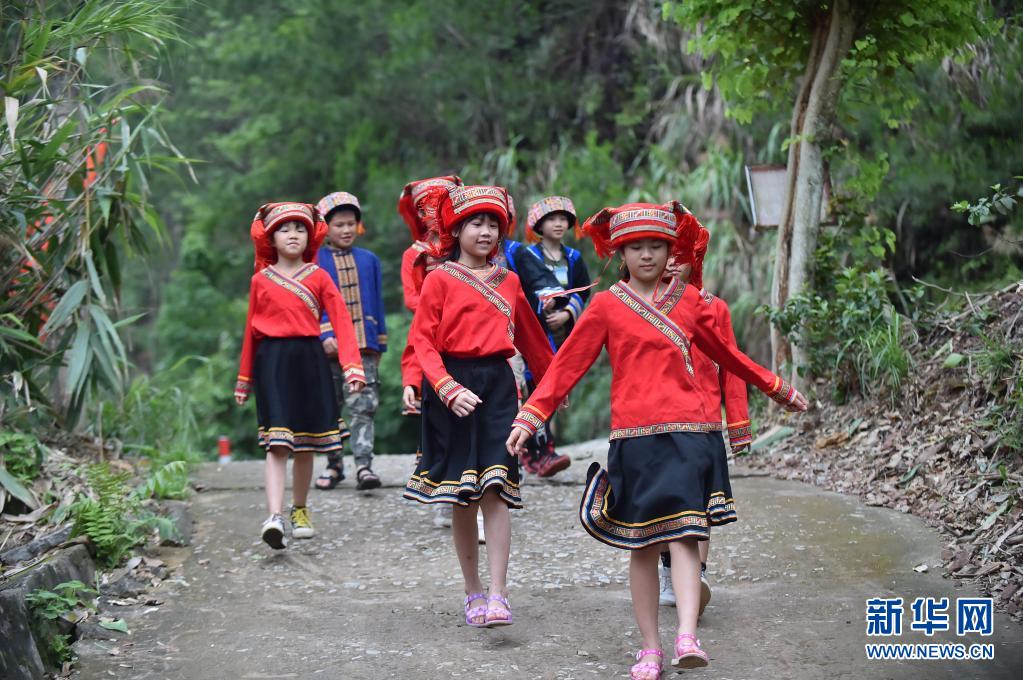 5月13日,在广西贺州八步区黄洞瑶族乡黄洞渡口,黄洞瑶族乡民族学校的小学生放学后来到渡口准备乘船回家。新华社记者 刘岭逸 摄