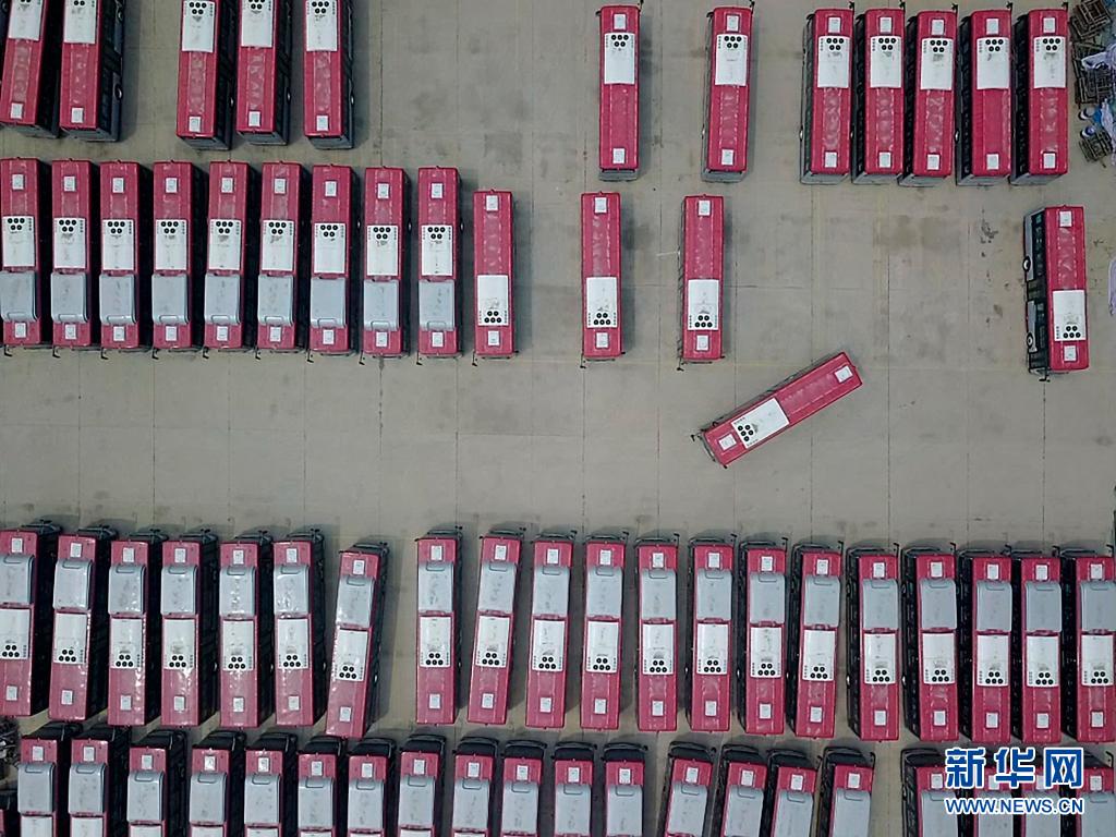 5月14日,在承德市高新技术产业开发区一家新能源客车生产企业,一辆新能源客车驶入停车场(无人机照片)。