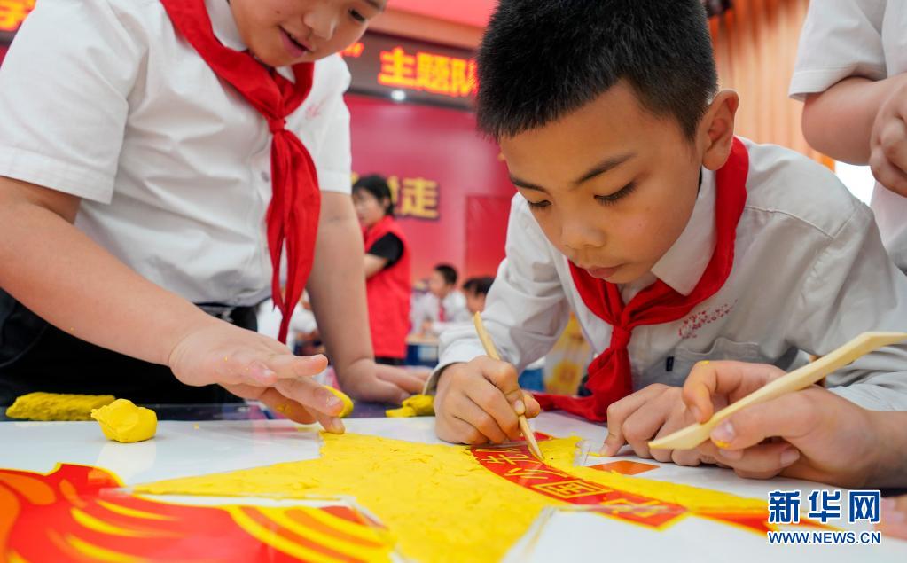 5月14日,在主题队会活动现场,火炬小学校的学生用彩色雕塑泥和木制雕塑刀进行少先队队徽的立体图案制作。