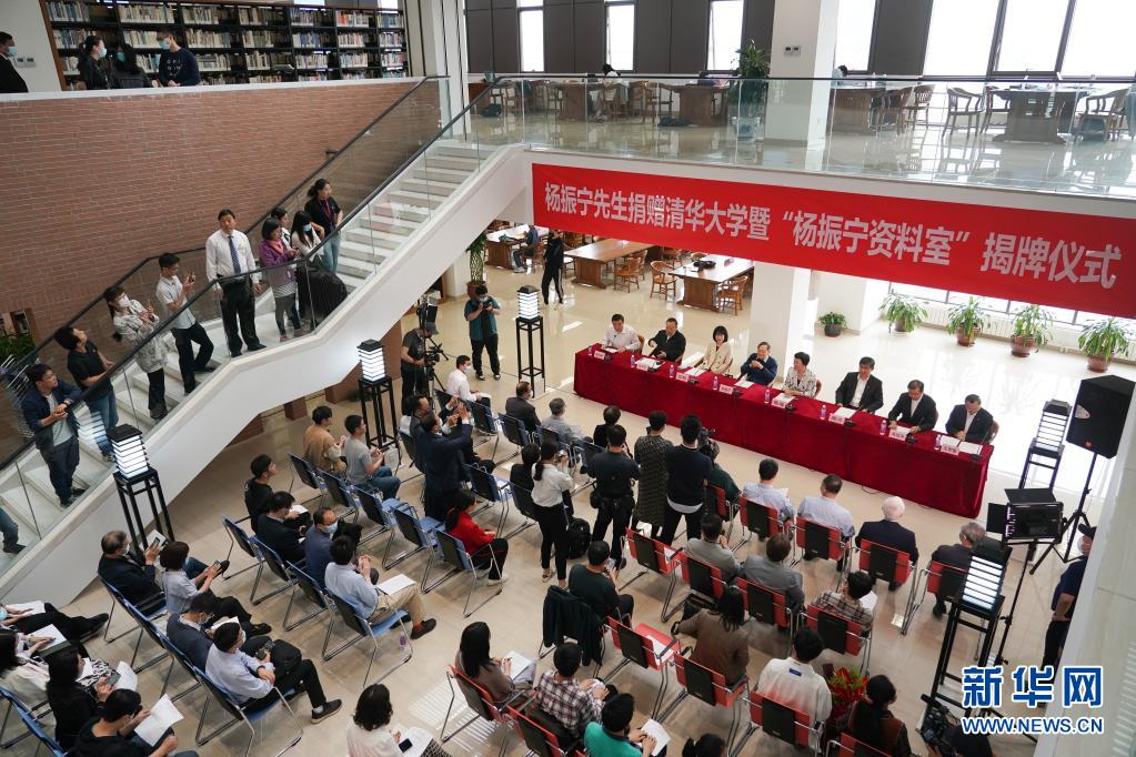 当日,杨振宁先生捐赠清华大学暨“杨振宁资料室”揭牌仪式在清华大学举行。为支持清华大学的教学科研、人才培养和文化传承,杨振宁将其珍藏的图书、文章手稿、来往书信、影像资料等无偿捐赠给清华大学。这批捐赠品共计2000余件(册),由清华大学图书馆接收并设立专室进行保管和展示。