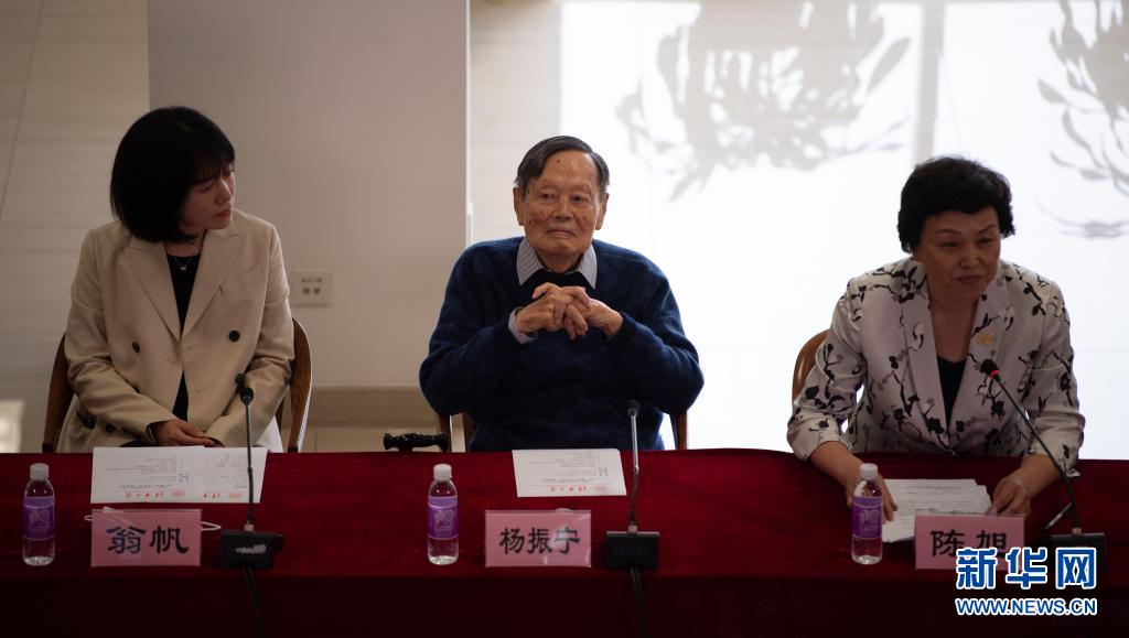 5月14日,杨振宁(中)、杨振宁夫人翁帆(左)和清华大学党委书记陈旭在捐赠仪式上。
