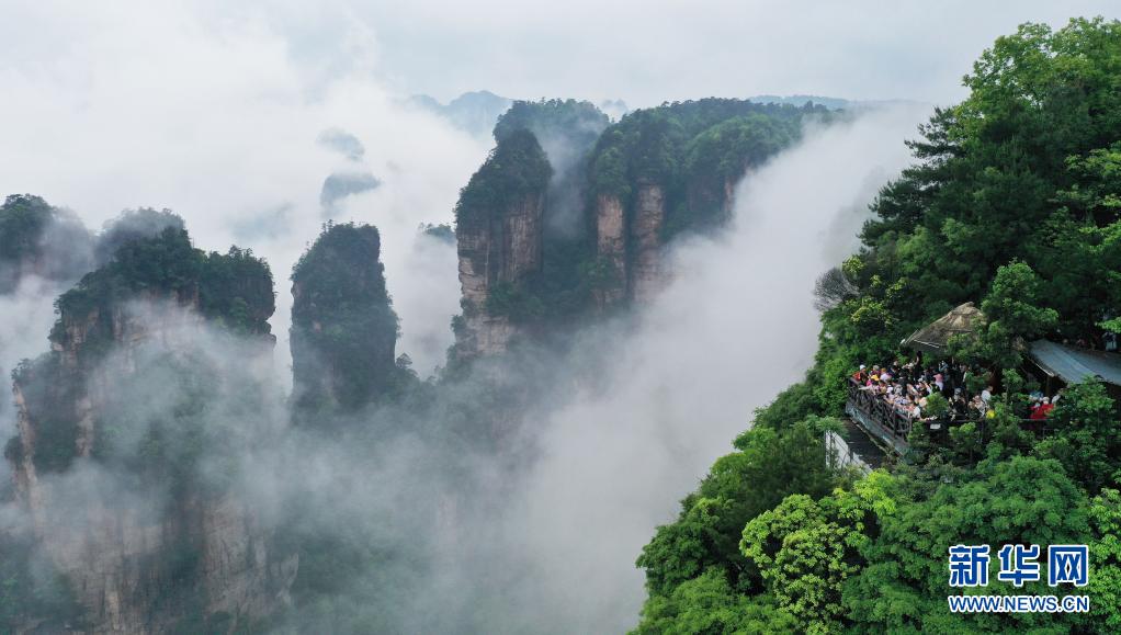 5月14日,游人在张家界武陵源景区欣赏峰林云海美景(无人机照片)。