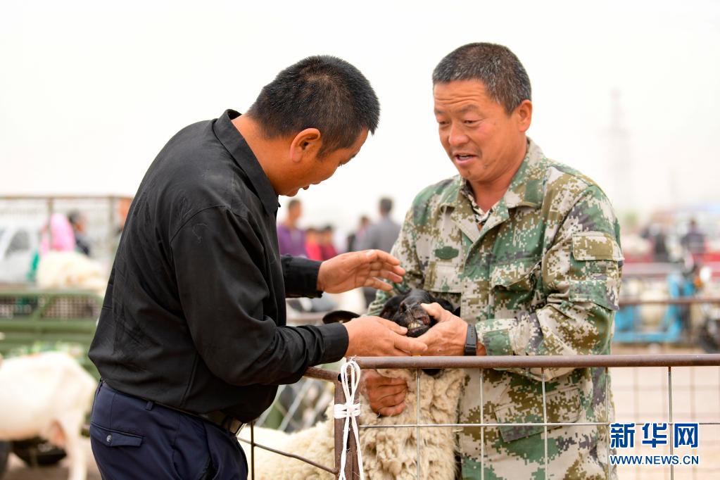 5月14日,在鄂托克前旗三段地农畜产品批发交易市场,买家在选购活羊。