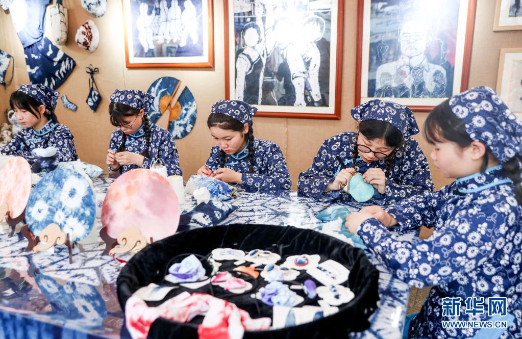 5月14日,四川省华蓥一中的学生在活动现场展示传统手工艺蓝染创意品制作。