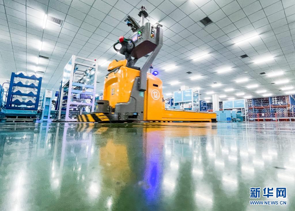 在位于吴江区盛泽镇的恒力化纤工业丝智能车间,运输机器人在车间内自动作业(5月14日摄)。
