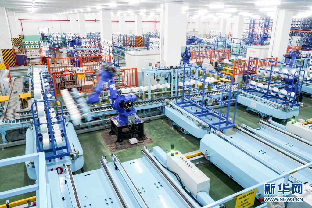 在位于吴江区盛泽镇的恒力化纤工业丝智能车间,机器人在车间内自动作业(5月14日摄)。