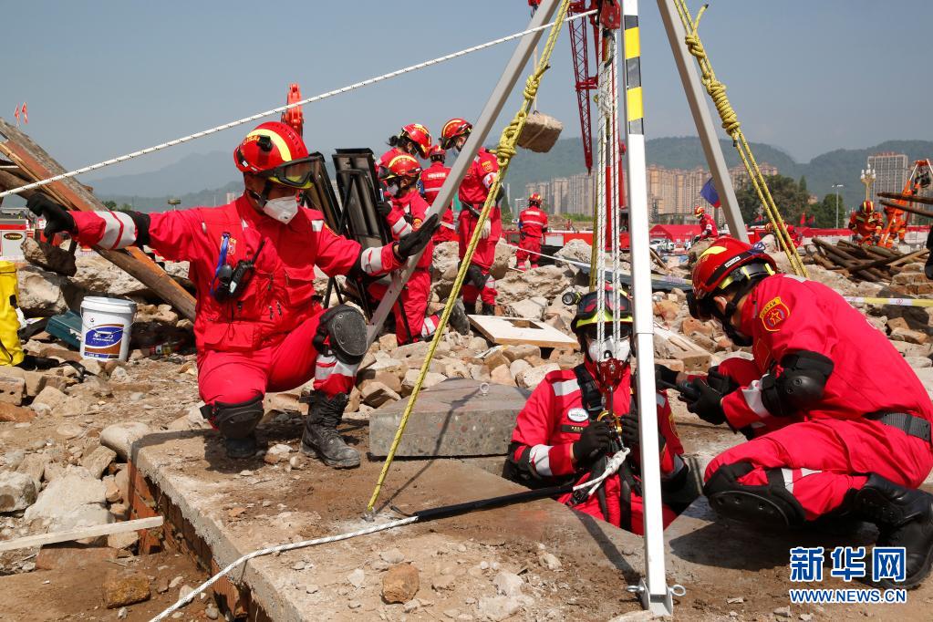 中国国际救援队队员利用倍力系统对“被困人员”实施救援(5月8日摄)。新华社发(强天林 摄)