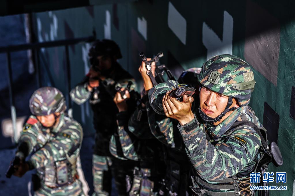 武警新疆总队某支队特战一中队官兵组织高层楼房反劫持突击训练(2019年6月17日摄)。新华社发(彭安田 摄)